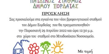 Read moreDetailsΤην Παρασκευή 29 Απριλίου τα εγκαίνια του νέου Βρεφονηπιακού Σταθμού του Δήμου Εορδαίας στο Μποδοσάκειο Νοσοκομείο, από την υφυπουργό Εργασίας και Κοινωνικών Υποθέσεων, αρμόδια για θέματα Πρόνοιας και Κοινωνικής Αλληλεγγύης,...