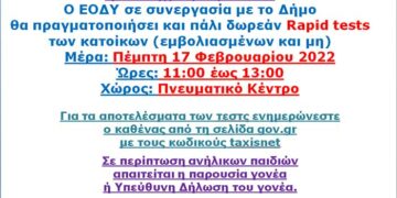 Read moreDetailsΟ ΕΟΔΥ σε συνεργασία με το Δήμο Βελβεντού θα πραγματοποιήσει και πάλι δωρεάν Rapid tests των κατοίκων (εμβολιασμένων και μη) Μέρα: Πέμπτη 17 Φεβρουαρίου 2022 Ώρες: 11:00 έως 13:00 Χώρος:...
