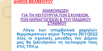 Read moreDetailsΟι σχολικές μονάδες Πρωτοβάθμιας & Δευτεροβάθμιας εκπαίδευσης (Νηπιαγωγεία, Δημοτικά, Γυμνάσια, Λύκεια) σε όλο το Δήμο Σερβίων, αύριο Τετάρτη 26 Ιανουαρίου 2022 θα λειτουργήσουν από τις 10:00 λόγω παγετού. Οι παιδικοί...
