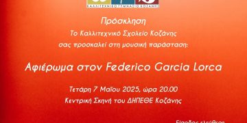 Read moreDetailsΤο Καλλιτεχνικό Σχολείο Κοζάνης παρουσιάζει, την Τετάρτη 7 Μαϊου 2025, στην Αίθουσα Τέχνης του ΔΗΠΕΘΕ Κοζάνης και ώρα 20.30 τη μουσική παράσταση "Αφιέρωμα στον Federico Garcia Lorca", με αγαπημένα τραγούδια...