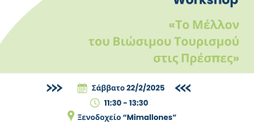 Read moreDetailsΕργαστήριο με θέμα: «Το Μέλλον του Βιώσιμου Τουρισμού στις Πρέσπες», που θα πραγματοποιηθεί το Σάββατο 22/2/2025 και ώρα 11:30 - 13:30, στο Ξενοδοχείο "Mimallones", στον Λαιμό Πρεσπών. Το εργαστήριο διοργανώνεται από τον Όμιλο...