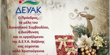 Read moreDetailsΟ Πρόεδρος Παναγιώτης Ματιάκης, τα μέλη του Διοικητικού Συμβουλίου, η Διεύθυνση και οι εργαζόμενοι της Δ.Ε.Υ.Α. Κοζάνης εύχονται σε όλους χρόνια πολλά, καλά Χριστούγεννα και ευτυχισμένος ο νέος χρόνος.