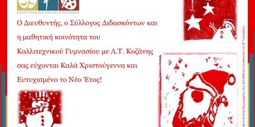 Read moreDetailsΟ Διευθυντής, ο Σύλλογος Διδασκόντων και η μαθητική κοινότητα του Καλλιτεχνικού Γυμνασίου με Λ.Τ. Κοζάνης σας εύχονται Καλά Χριστούγεννα και Ευτυχισμένο το Νέο Έτος!