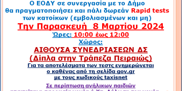 Read moreDetailsΟ ΕΟΔΥ σε συνεργασία με το Δήμο θα πραγματοποιήσει και πάλι δωρεάν Rapid tests των κατοίκων (εμβολιασμένων και μη) Την Παρασκευή 8 Μαρτίου 2024 Ώρες: 10:00 έως 12:00 Χώρος: ΑΙΘΟΥΣΑ...
