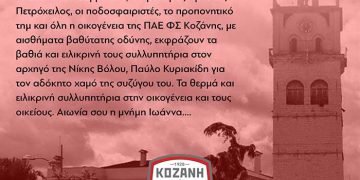 Read moreDetailsΤο Διοικητικό Συμβούλιο, ο Πρόεδρος Χρήστος Πετρόχειλος, οι ποδοσφαιριστές, το προπονητικό τημ και όλη η οικογένεια της ΠΑΕ ΦΣ Κοζάνης, με αισθήματα βαθύτατης οδύνης, εκφράζουν τα βαθιά και ειλικρινή τους...