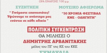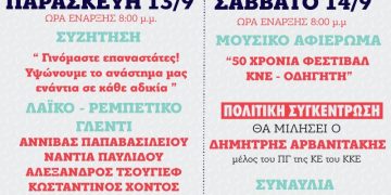 Read moreDetailsΑναλυτικά το πρόγραμμα των εκδηλώσεων της 1ης μέρας του 50ου Φεστιβάλ ΚΝΕ-Οδηγητή στην Κοζάνη: Παρασκευή 13 Σεπτέμβριου: Ώρα έναρξης 20:00 –Συζήτηση «Γινόμαστε επαναστάτες! Υψώνουμε το ανάστημά μας ενάντια σε κάθε...