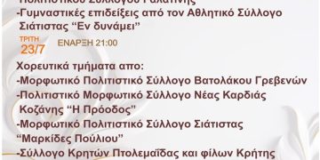 Read moreDetailsΔευτέρα 22/7 - Μοντέρνος χορός από τα τμήματα του Μορφωτικού Πολιτιστικού Συλλόγου Γαλατινής - Γυμναστικές επιδείξεις από τον Αθλητικό Σύλλογο Σιάτιστας «Εν δυνάμει» Ώρα έναρξης: 21:00 Τρίτη 23/7 Χορευτικά τμήματα...