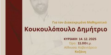 Το Παράρτημα Κοζάνης της Ε.Μ.Ε. σας προσκαλεί στην τιμητική εκδήλωση για τον διεθνούς φήμης Κοζανίτη Μαθηματικό ΚΟΥΚΟΥΛΟΠΟΥΛΟ ΔΗΜΗΤΡΙΟ, την Κυριακή 14 Δεκεμβρίου 2025 στις 11.00 π.μ. στην Αίθουσα εκδηλώσεων Δημοτικού...