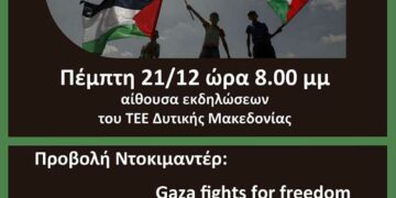 Read moreDetailsΕκδήλωση - συζήτηση για την Παλαιστίνη και τον Πόλεμο Προβολή ντοκιμαντέρ: Gaza fights for freedom Ομιλία από τον Παλαιστίνιο αγωνιστή Γιαχία Ασκέρ. Πέμπτη 21/12/23 ώρα 8.00 μμ στην αίθουσα εκδηλώσεων...