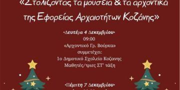 Read moreDetailsΗ Εφορεία Αρχαιοτήτων Κοζάνης σε συνεργασία με την Πρωτοβουλία Νέων Κοζάνης, για τρίτη συνεχόμενη χρονιά, διοργανώνει χριστουγεννιάτικες εκδηλώσεις με τίτλο «Στολίζοντας τα μουσεία και τα αρχοντικά της Εφορείας Αρχαιοτήτων Κοζάνης»....