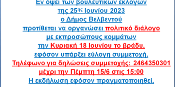 Read moreDetailsΕν όψει των βουλευτικών εκλογώντ ης 25ης Ιουνίου 2023 ο Δήμος Βελβεντού προτίθεται να οργανώσει πολιτικό διάλογο με εκπροσώπους κομμάτων την Κυριακή 18 Ιουνίου το βράδυ, εφόσον υπάρξει εύλογη συμμετοχή....