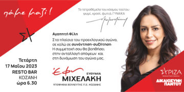 Read moreDetailsΣυνάντηση γυναικών με την υποψήφια βουλευτή ΣΥΡΙΖΑ-ΠΣ Έφη Μιχελάκη την Τετάρτη 17.05.2023 στο RESTO BAR στην Κοζάνη