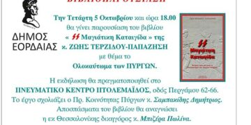 Read moreDetailsΤην Τετάρτη 5 Οκτωβρίου και ώρα 18.00 θα γίνει παρουσίαση του βιβλίου «Μαγιάτικη Καταιγίδα » της κ. ΖΩΗΣ ΤΕΡΖΙΔΟΥ-ΠΑΠΑΖΗΣΗ µε θέµα το Ολοκαύτωµα των ΠΥΡΓΩΝ. Η εκδήλωση θα πραγµατοποιηθεί στο...