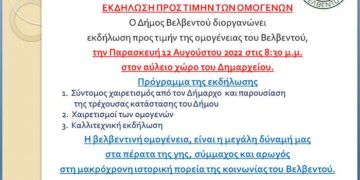 ΔΗΜΟΣ ΒΕΛΒΕΝΤΟΥ: ΕΚΔΗΛΩΣΗ ΠΡΟΣ ΤΙΜΗΝ ΤΩΝ ΟΜΟΓΕΝΩΝ Ο Δήμος Βελβεντού διοργανώνει εκδήλωση προς τιμήν της ομογένειας του Βελβεντού, την Παρασκευή 12 Αυγούστου 2022 στις 8:30 μ.μ. στον αύλειο χώρο του...