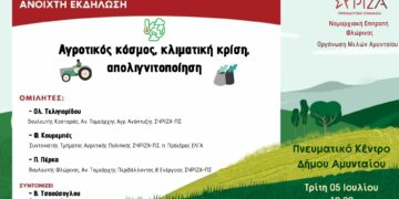 Read moreDetailsΗ Νομαρχιακή Επιτροπή του ΣΥΡΙΖΑ-ΠΣ Φλώρινας και η Οργάνωση Μελών Αμυνταίου διοργανώνει Ανοιχτή Εκδήλωση, με θέμα: «Αγροτικός Κόσμος, Κλιματική Κρίση, Απολιγνιτοποίηση», την Τρίτη 05/07 και ώρα 19:00 στο Πνευματικό Κέντρο...