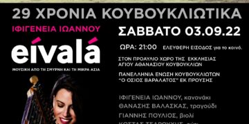 Read moreDetails29 χρόνια Κουβουκλιώτικα Σάββατο 3 Σεπτεμβρίου στον προαύλιο χώρο της εκκλησίας του Αγίου Αθανασίου Κουβουκλιων με μουσικές μελωδίες από την Σμύρνη και την Μικρά Ασία Είσοδος ελεύθερη