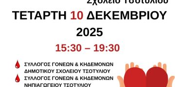 Read moreDetailsΟι σύλλογοι γονέων και κηδεμόνων Δημοτικού –Νηπιαγωγείου, η ομάδα Εθελοντών Αιμοδοτών Τσοτυλίου και ο Δήμος Βοΐου διοργανώνουν Αιμοδοσία στη Δημοτική Ενότητα Τσοτυλίου την Τετάρτη 10 Δεκεμβρίου 2025 ώρα 15:30 –...
