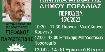 Read moreDetailsΤην Εορδαία θα επισκεφθεί την Πέμπτη 15-06 το μέλος Κ.Π.Ε. ΠΑΣΟΚ – Κινήματος Αλλαγής, Στέφανος Παραστατίδης. Το πρόγραμμα της περιοδείας του είναι το εξής: 10:30-11:30 Πύργοι – Μεσόβουνο – Κομνηνά...