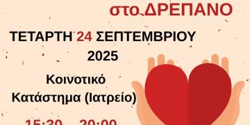 Read moreDetailsΤην Τετάρτη 24 Σεπτεμβρίου 2025 και ΩΡΑ 15:30-20:00 (προσέλευση μέχρι 19:30) στον χώρο του Κοινοτικού Ιατρείου του Δ.Δ. Δρεπάνου θα γίνει Αιμοδοσία σε συνεργασία με την Τοπική Κοινότητα, Πολιτιστικό...