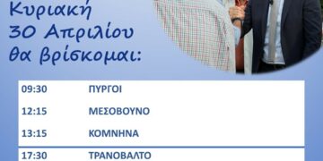 Read moreDetailsΤο πρωί της Κυριακής 30 Απριλίου ο υποψήφιος Βουλευτής της ΝΔ Στάθης Κωνσταντινίδης θα επισκεφθεί τα χωριά της Εορδαίας Πύργους, Μεσόβουνο και Κομνηνά. Το απόγευμα θα βρεθεί στο Τρανόβαλτο και...