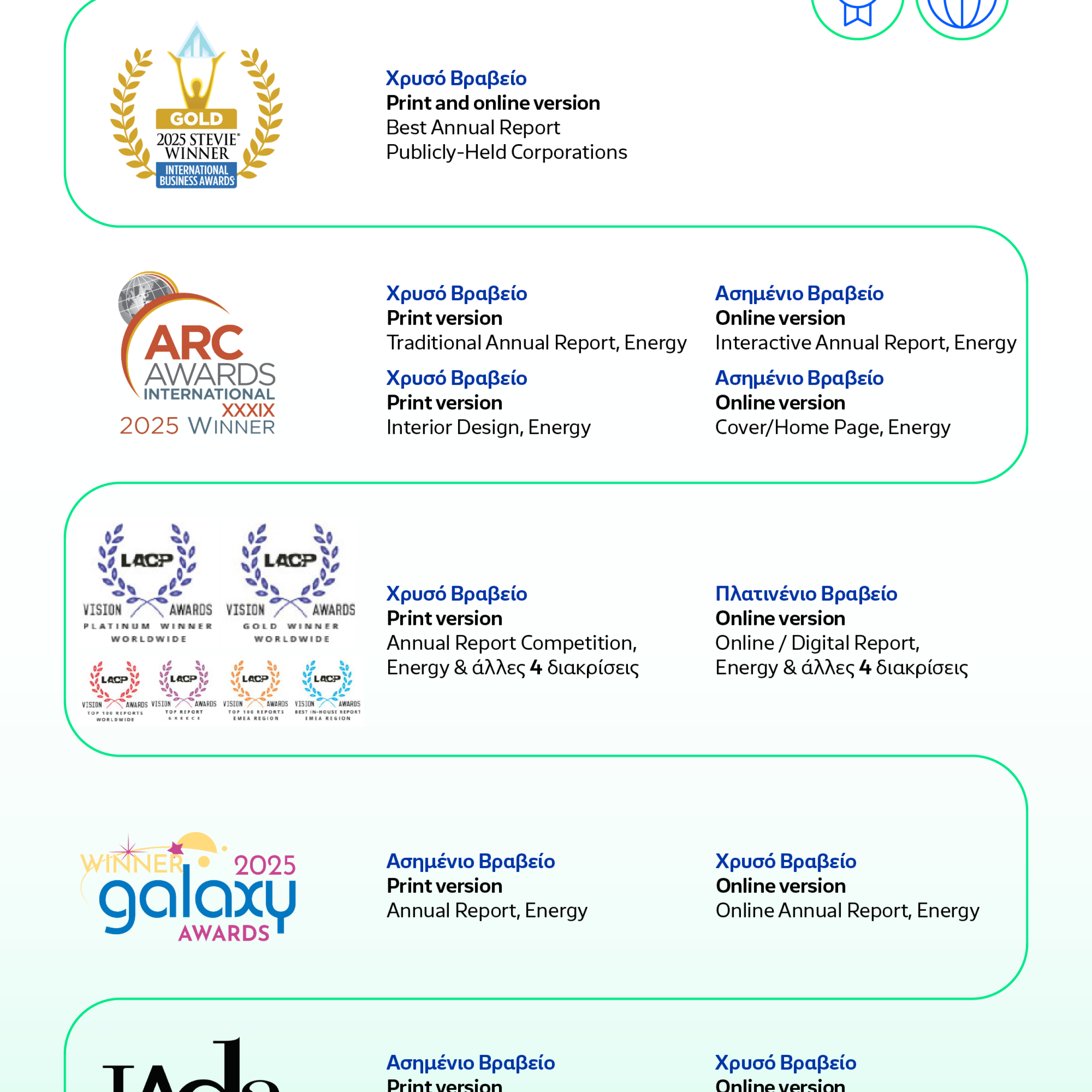 Το 2025, ο διαγωνισμός “2024 Vision Awards Annual Report Competition” του οργανισμού “The League of American Communications Professionals (LACP)”, συγκέντρωσε πάνω από 1.000 συμμετοχές από 21 χώρες και 4 ηπείρους, οι οποίες εκπροσωπεύουν ένα ευρύ φάσμα εταιρειών και οργανισμών από διάφορους κλάδους και μεγέθη.