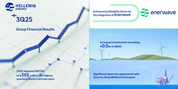 Η HELLENiQ ENERGY Holdings Α.Ε. («Εταιρεία») ανακοίνωσε τα ενοποιημένα οικονομικά αποτελέσματα Γ’ Τριμήνου 2025, με τα Συγκρίσιμα Κέρδη (για το τρίμηνο) EBITDA να διαμορφώνονται στα €365 εκατ. και τα Συγκρίσιμα Καθαρά Κέρδη στα €186 εκατ..