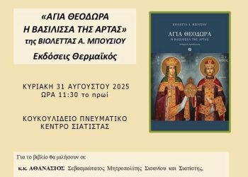 Read moreDetails- Παρουσίαση Βιβλίου στη Σιάτιστα «ΑΓΙΑ ΘΕΟΔΩΡΑ Η ΒΑΣΙΛΙΣΣΑ ΤΗΣ ΑΡΤΑΣ» της Βιολέτας Α. Μπούσιου Για το Βιβλίο θα μιλήσουν...