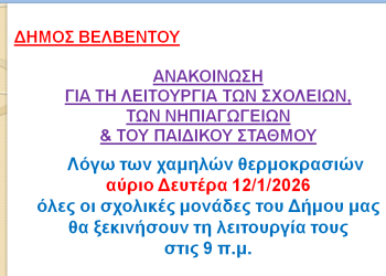 Την Κυριακή 18 Ιανουαρίου 2026, στο εξωκλήσι του Αγίου Αθανασίου Βελβεντού ανήμερα της γιορτής, θα τελεστεί θεία λειτουργία (που θα...