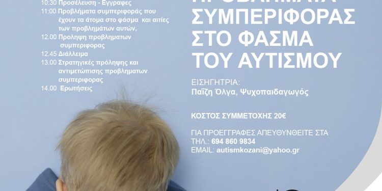 Ο Σύλλογος Γονέων Κηδεμόνων και Φίλων Ατόμων με αυτισμό Ν.Κοζάνης την Κυριακή, 30 Νοεμβρίου 2025, διοργανώνει ημερίδα με θέμα: «Αυτισμός και Προβλήματα Συμπεριφοράς» στην αίθουσα σεμιναρίων του Τεχνικού Επιμελητηρίου Ελλάδος Τμήμα Δυτικής Μακεδονίας στην οδό Εστίας και Μπουσίου (1ος όροφος) στην Κοζάνη.
