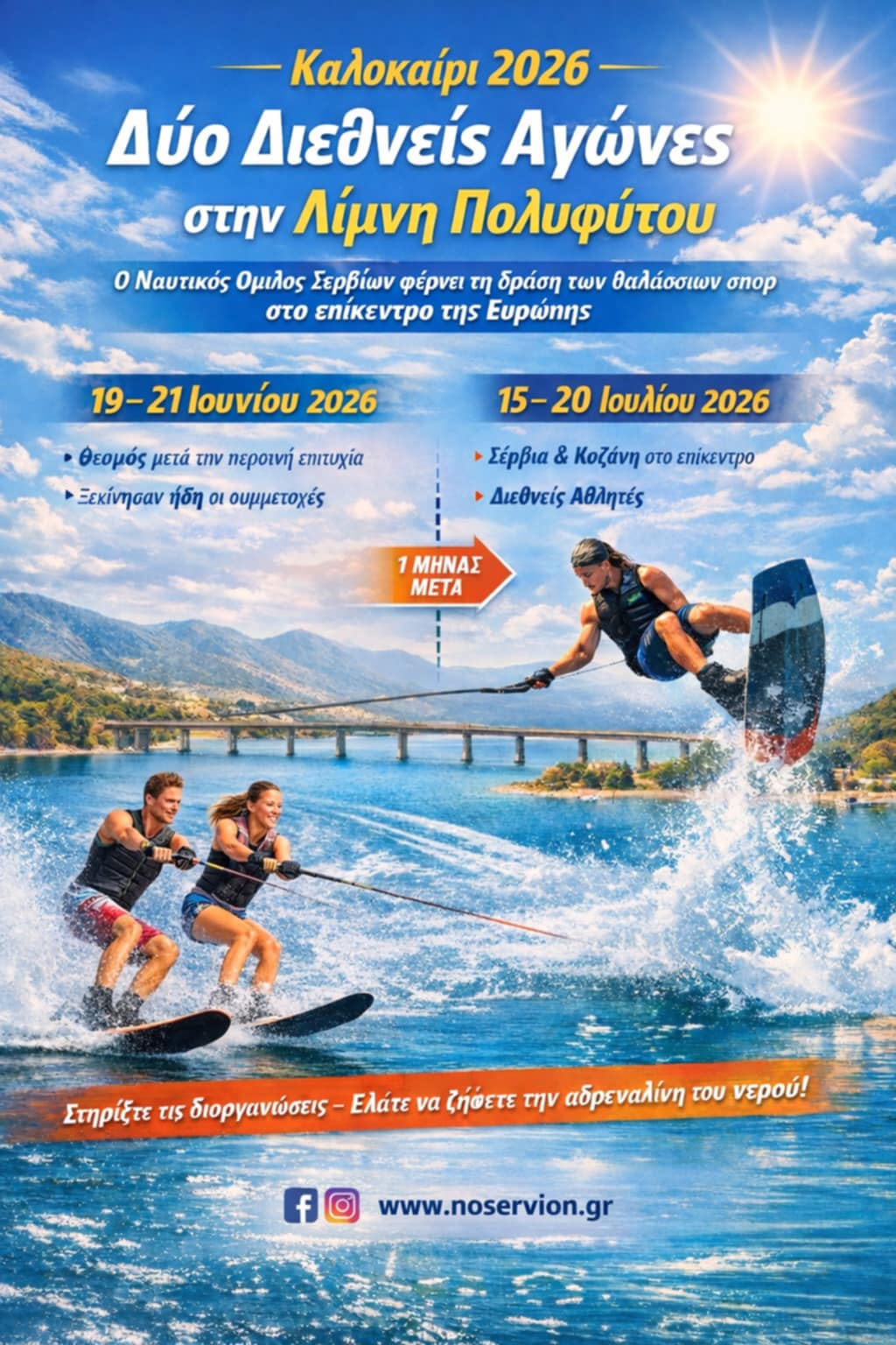 Η αναμονή τελείωσε! Ο Ναυτικός Όμιλος Σερβίων, παρά το νεαρό της ίδρυσής του, φέρνει φέτος στην περιοχή δύο σημαντικές διεθνείς διοργανώσεις, επιβεβαιώνοντας τη δυναμική και το όραμά του. Από 19 έως 21 Ιουνίου θα πραγματοποιηθεί ο Διεθνής Αγώνας Θαλάσσιου Σκι, συνέχεια της περσινής επιτυχημένης πρώτης διοργάνωσης. Ο αγώνας καθιερώνεται πλέον ως θεσμός, όπως είχε δεσμευτεί ο Όμιλος. Λιγότερο από έναν μήνα αργότερα, από 15 έως 20 Ιουλίου, θα διεξαχθεί ο Πανευρωπαϊκός Αγώνας Wake, φέρνοντας τα Σέρβια και την Κοζάνη στο επίκεντρο του ευρωπαϊκού αθλητικού ενδιαφέροντος και προσελκύοντας κορυφαίους αθλητές από όλη την Ευρώπη. Η διοργάνωση δύο διεθνών αγώνων σε τόσο σύντομο χρονικό διάστημα αποτελεί σημαντική πρόκληση και ταυτόχρονα αποδεικνύει την οργάνωση, τη συνέπεια και το όραμα του Ναυτικού Ομίλου Σερβίων. Ο Όμιλος καλεί φορείς, συλλόγους, επαγγελματίες και πολίτες να σταθούν στο πλευρό αυτής της προσπάθειας, στηρίζοντας διοργανώσεις που αναδεικνύουν τον τόπο και τον αθλητισμό σε εθνικό και ευρωπαϊκό επίπεδο