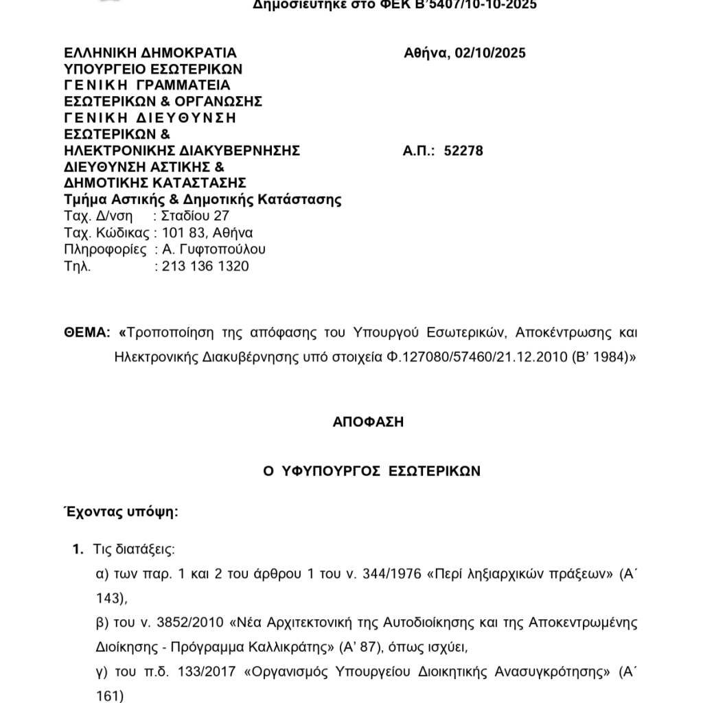 «Τροποποίηση της απόφασης του Υπουργού Εσωτερικών, Αποκέντρωσης και Ηλεκτρονικής Διακυβέρνησης υπό στοιχεία Φ.127080/57460/21.12.2010 (Β’ 1984)»