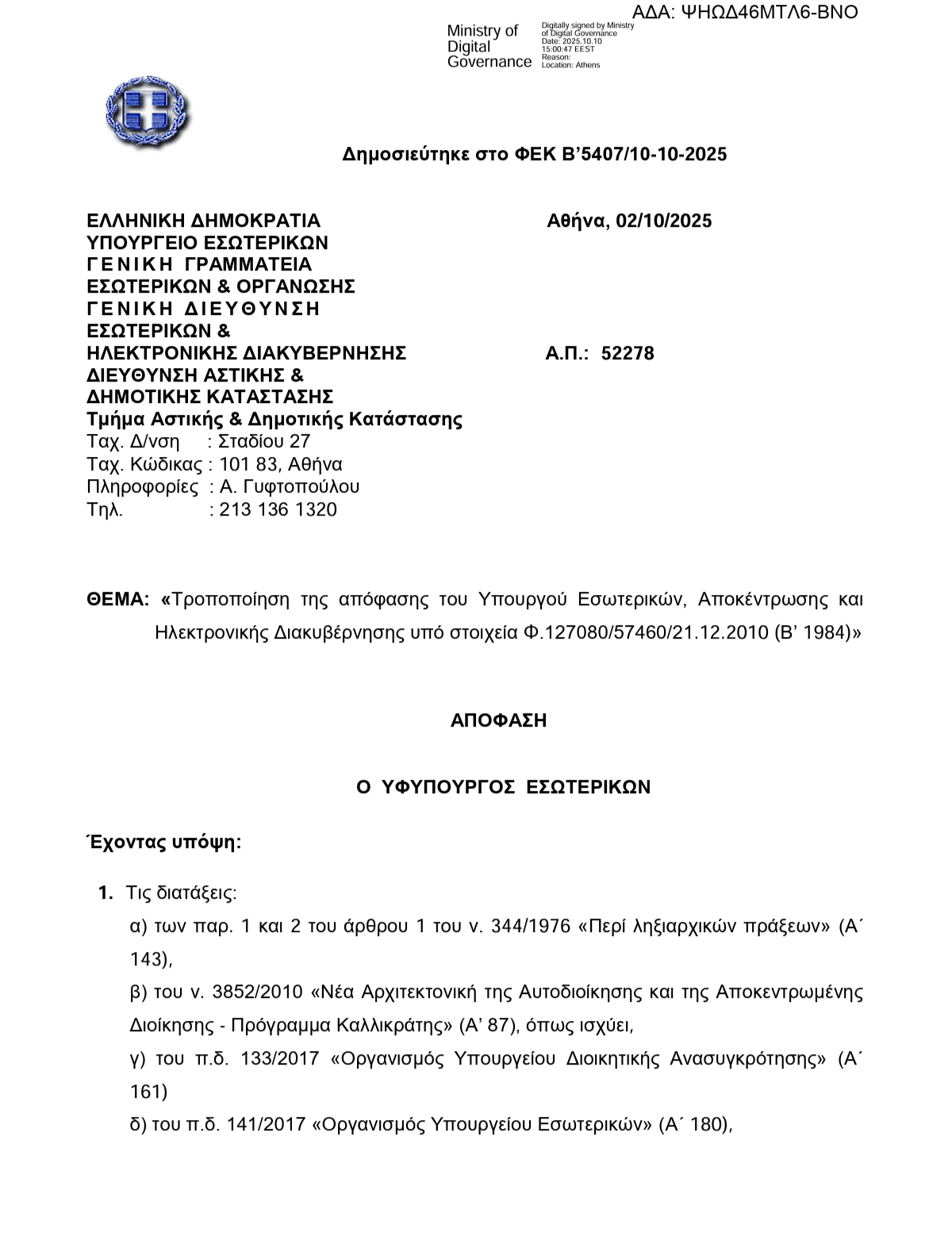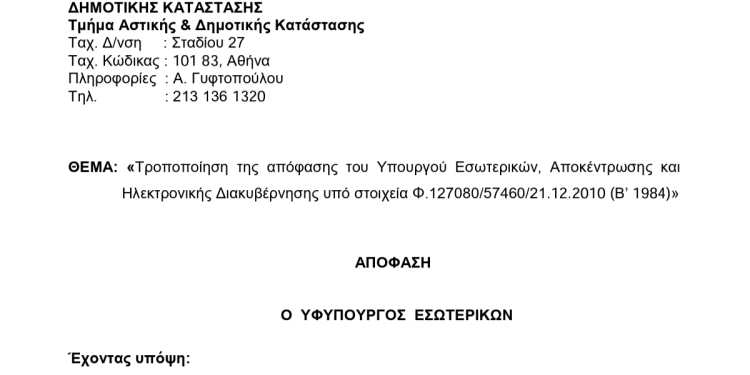 «Τροποποίηση της απόφασης του Υπουργού Εσωτερικών, Αποκέντρωσης και Ηλεκτρονικής Διακυβέρνησης υπό στοιχεία Φ.127080/57460/21.12.2010 (Β’ 1984)»