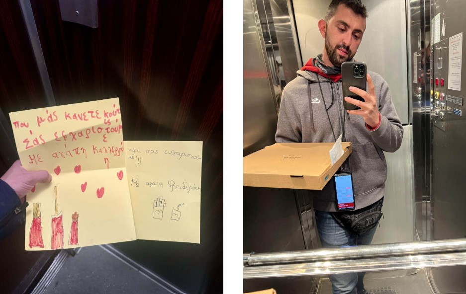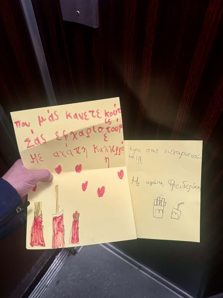 Μια τέτοια στιγμή είχε και ο Τάσος, ένας ντελιβεράς στην Κοζάνη που μετρά 13 πλέον χρόνια σε αυτό το επάγγελμα. Μια μικρή πράξη ευγνωμοσύνης από δύο μικρά κοριτσάκια όταν τους παρέδοσε το φαγητό τους. Δύο ζωγραφιές με ένα ευχαριστήριο μήνυμα!!!