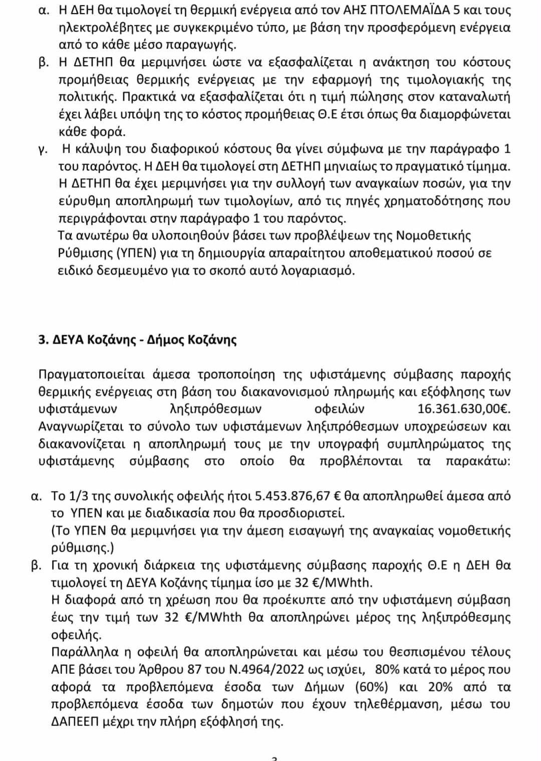 Ανάλογη δέσμευση ποσού ύψους 380.000 ευρώ από τη ΔΕΗ έγινε και σε τέλη από ΑΠΕ του Δήμου Εορδαίας, όπου, ωστόσο, σύμφωνα με τη σχετική σύμβαση, το εν λόγω κονδύλιο δεν αφορά σε κανένα χωριό, αλλά μόνο στην πόλη της Πτολεμαϊδας, με την εκεί συμφωνία να είναι διαφορετική σε σχέση με το Δήμο Κοζάνης.