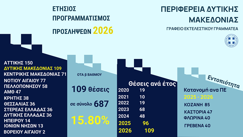 Με ιδιαίτερη ικανοποίηση ανακοινώνουμε ότι για το έτος 2026, η Περιφέρεια Δυτικής Μακεδονίας πέτυχε αριθμό-ρεκόρ 109 θέσεων εργασίας, τον δεύτερο υψηλότερο πανελλαδικά μετά την Περιφέρεια Αττικής (150 θέσεις).