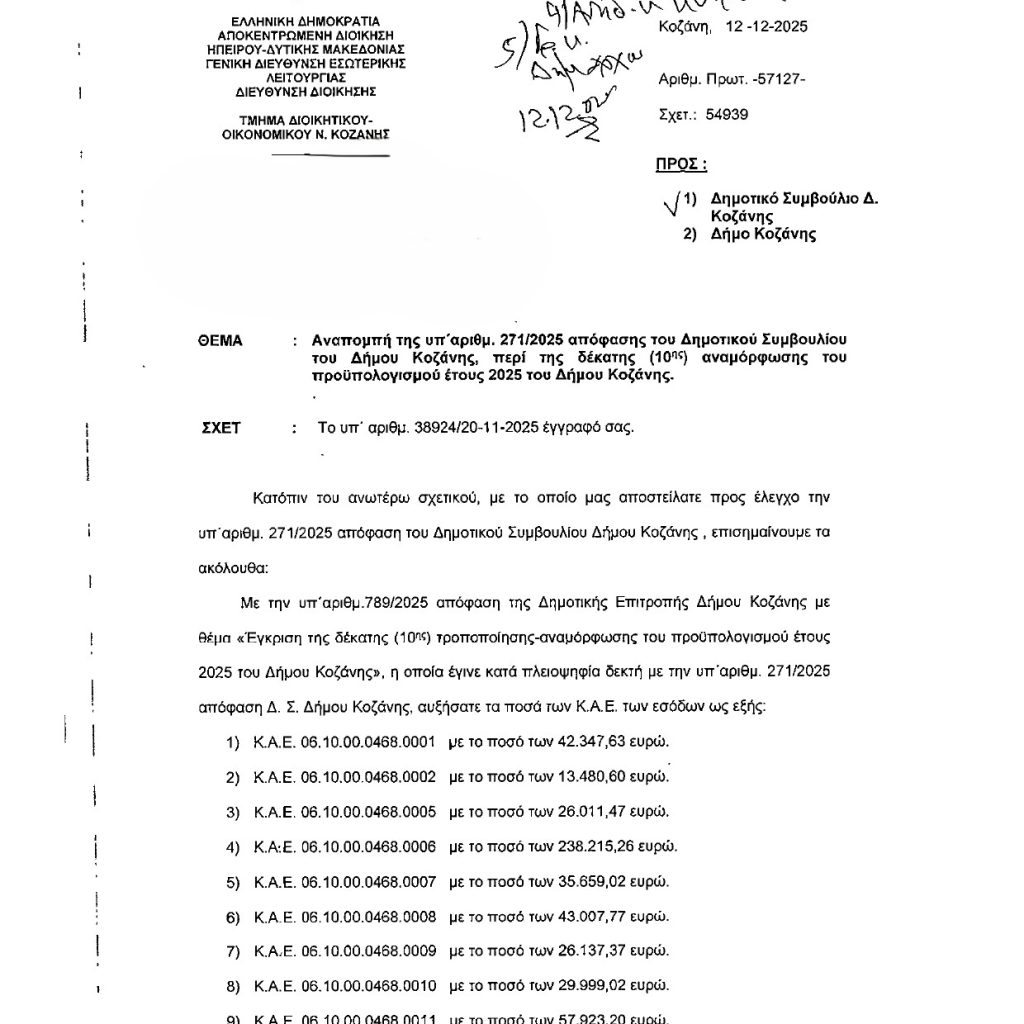 “Με μεγάλη ικανοποίηση πληροφορηθήκαμε ότι η Αποκεντρωμένη Διοίκηση Ηπείρου – Δυτ. Μακεδονίας με το έγγραφό της με αρ. πρωτ. 54939/12-12-2025 αναπέμπει προς επαναδιατύπωση την απόφαση 271/2025 του Δημοτικού Συμβουλίου σύμφωνα με την οποία ποσά συνολικού ύψους 632.674,76 ευρώ που προέρχονται από το ειδικό τέλος ΑΠΕ για 13 τοπικές κοινότητες του Δήμου χρησιμοποιήθηκαν για την αποπληρωμή χρέους του Δήμου Κοζάνης προς την ΔΕΥΑΚ για κόστος τηλεθέρμανσης.