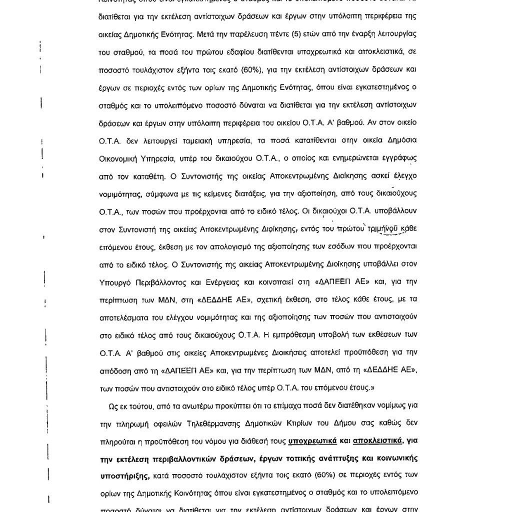 Σύμφωνα με την απόφαση «τα επίμαχα ποσά δεν διατέθηκαν νομίμως καθώς δεν πληρούται η προϋπόθεση του Νόμου για διάθεσή τους υποχρεωτικά και αποκλειστικά για την εκτέλεση περιβαλλοντικών δράσεων, έργων τοπικής ανάπτυξης και κοινωνικής συνοχής».