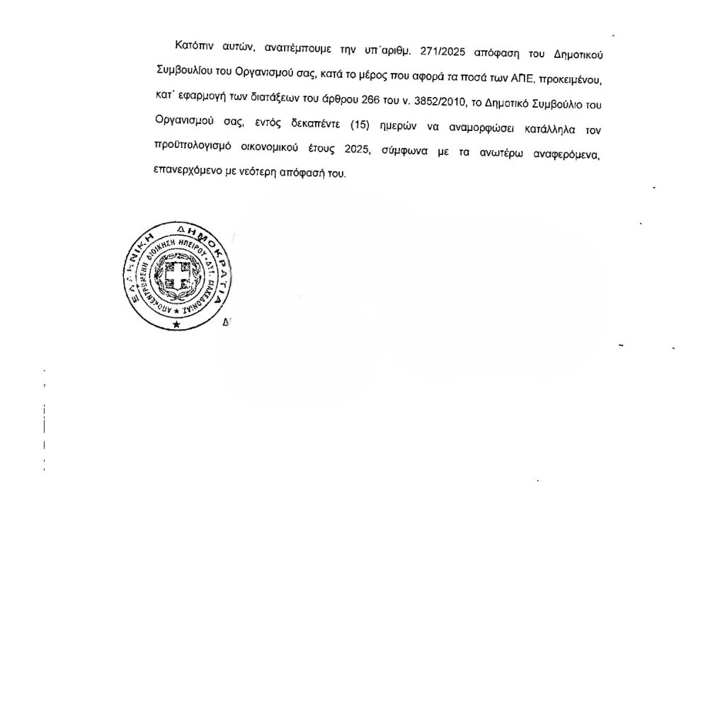 Με την απόφαση της αυτή η Αποκεντρωμένη Διοίκηση Ηπείρου – Δυτ. Μακεδονίας όπως έχει την αρμοδιότητα, αναπέμπει την απόφαση του Δημοτικού Συμβουλίου και ζητά την αναμόρφωση του προϋπολογισμού του έτους 2025 εντός 15 ημερών!