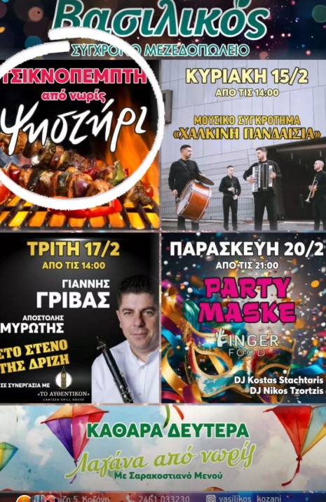 kozanimedia: Νόστιμη αποκριά στο σύγχρονο μεζεδοπωλείο “Βασιλικός” στην Κοζάνη – Δείτε το πρόγραμμα
