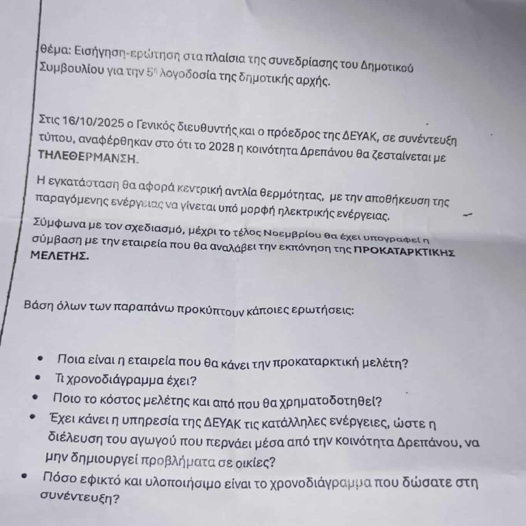 Πρωτοφανής στάση της δημοτικής αρχής Κοκκαλιάρη σε διαδικασία λογοδοσίας, καθώς το απόγευμα της Τετάρτης αρνήθηκε να απαντήσει σε προγραμματισμένη (από τις 16 Οκτωβρίου, καθώς στις εν λόγω συνεδριάσεις οι ερωτήσεις της αντιπολίτευσης αποστέλλονται πολλές ημέρες πριν και γραπτώς) ερώτηση του ανεξάρτητου δημοτικού συμβούλου Δημήτρη Κορωνίδη για την τηλεθέρμανση στο Δρέπανο, με την επίκληση και τη δικαιολογία της απουσίας του προέδρου της ΔΕΥΑΚ Παναγιώτη Ματιάκη. Αν και σε πολλές ανάλογες ερωτήσεις, στο παρελθόν, απαντούσε και ο δήμαρχος, απόψε αρνήθηκε να το πράξει, προκαλώντας πολλές και εύλογες απορίες για τη συγκεκριμένη στάση, απέναντι σε σειρά σημαντικών θεμάτων που θίγει ο Δ. Κορωνίδης.