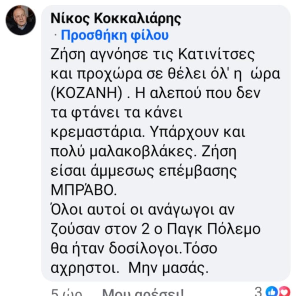 Kozanimedia: “Υπάρχουν και πολλοί…μαλακόβλακες”-Ο πατέρας του δημάρχου Κοζάνης Νίκος Κοκκαλιάρης στηρίζει το “θυμό” του αντιδήμαρχου Ζήση Στημονιάρη για δημότες που κάνουν καταγγελίες στα sites για λακκούβες και άλλα ζητήματα – “Όλοι αυτοί οι ανάγωγοι αν ήταν στον Β’ Παγκόσμιο Πόλεμο θα ήταν δωσίλογοι”.