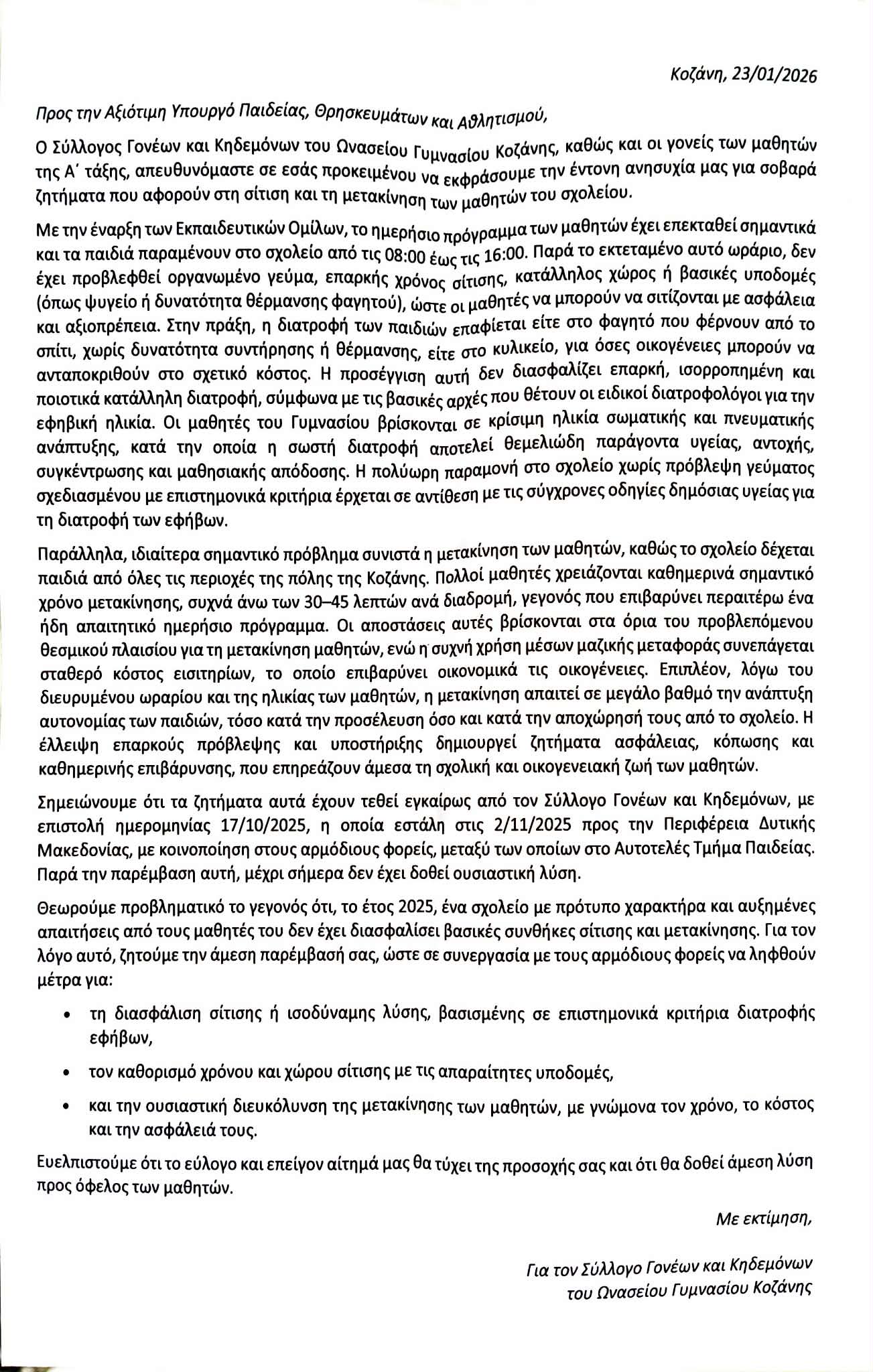 Kozanimedia: Aυτή είναι η επιστολή που έδωσε στην υπουργό Παιδείας Σοφία Ζαχαράκη αντιπροσωπεία του Συλλόγου Γονέων & Κηδεμόνων του Ωνάσειου Γυμνασίου Κοζάνης-Τι ζητούν για τη σίτιση και τη μετακίνηση
