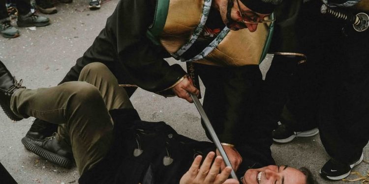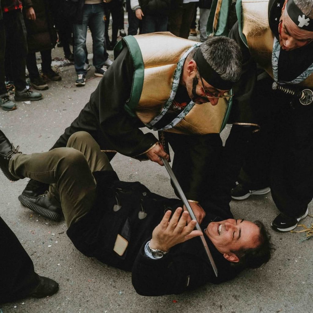 Με δηκτική ανάρτηση στο Facebook και φωτογραφία με…σαμουράι να βάζει το μαχαίρι στο λαιμό του δημάρχου Κοζάνης (στιγμιότυπο από την αποκριάτικη παρέλαση), ο ανεξάρτητος δημοτικός σύμβουλος Δημήτρης Κορωνίδης γράφει: “