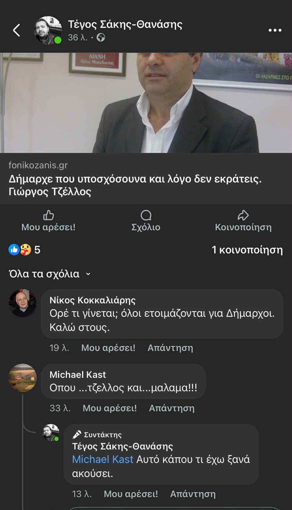 Δείτε το ειρωνικό σχόλιο του Νίκου Κοκκαλιάρη για τον πρώην δήμαρχο Αιανής Γιώργο Τζέλλο, ο οποίος, με την παρέμβασή του, ασκεί κριτική στον…γιο του δήμαρχο Κοζάνης Γιάννη Κοκκαλιάρη για τη συμπεριφορά του στο θέμα του ληξιαρχείου.