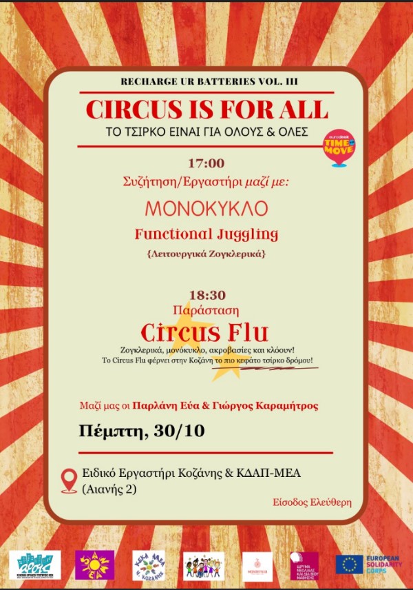 Η S.A.N. Team της ΑΡΣΙΣ Κοζάνης σας καλεί στην εκδήλωση Circus is for All, του 3ου Recharge Your Batteries Festival, την Πέμπτη 30 Οκτωβρίου, στις 17:00, στο χώρο του Ειδικού Εργαστηρίου Κοζάνης και του ΚΔΑΠ-μεΑ Δήμου Κοζάνης (Αιανής 2).