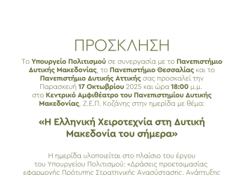 Το Υπουργείο Πολιτισμού, σε συνεργασία με το Πανεπιστήμιο Δυτικής Μακεδονίας, το Πανεπιστήμιο Θεσσαλίας, και το Πανεπιστήμιο Δυτικής Αττικής, ανακοινώνει τη διοργάνωση Ημερίδας με τίτλο «Η Ελληνική Χειροτεχνία στη Δυτική Μακεδονία ...