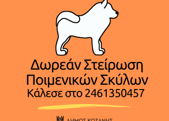 Ο Δήμος Κοζάνης ενημερώνει τους κτηνοτρόφους που δραστηριοποιούνται στα όριά του, για τη δυνατότητα δωρεάν στείρωσης των ποιμενικών τους σκύλων, κλείνοντας άμεσα ραντεβού μέσω της δημοτικής τηλεφωνικής γραμμής, καλώντας στο ...