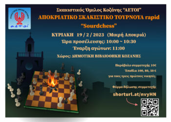 Την Κυριακή της Μικρής Αποκριάς 19/2/2023 διοργανώνεται από τον Σκακιστικό Όμιλο Κοζάνης τουρνουά σκακιού "Sourdchess".