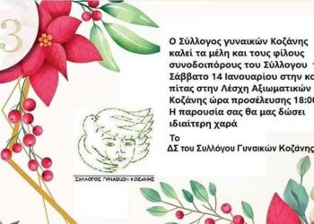 Ο Σύλλογος γυναικών Κοζάνης καλεί τα μέλη και τους φίλους συνοδοιπόρους του Σύλλογου στην κοπή πίτας το Σαββατο 14 Ιανουαρίου στην Λέσχη Αξιωματικών Κοζάνης ώρα προσέλευσης 18:00 .Η παρουσία σας ...