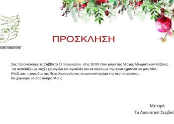 Σας προσκαλούμε στην ετήσια κοπή της πρωτοχρονιάτικης πίτας Όλοι εμείς μέλη του Σύλλογου ,πολυαριθμοι φίλοι ,Συνοδοιπόροι του Συλλόγου Γυναικών Κοζανης θα ξαναβρεθούμε στο ζεστο χωρο της Λέσχης Αξιωματικών Κοζάνης να ...
